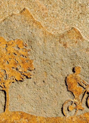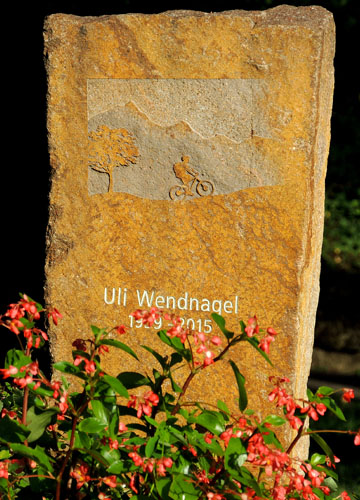 Grabstein aus Porphyr und Relief einer Landschaft mit Mountainbiker