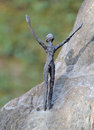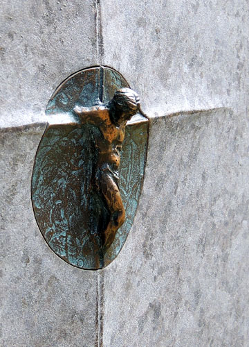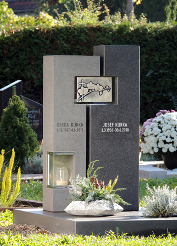 Grabmal aus Granit mit eingearbeiteter Bronzefigur und erhabenem Kreuz
