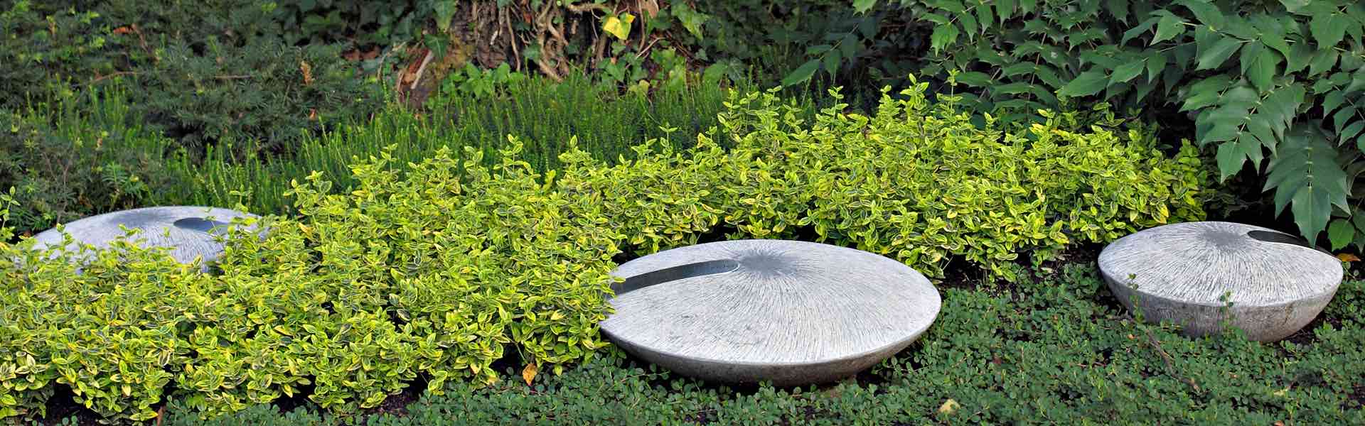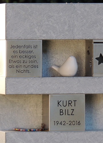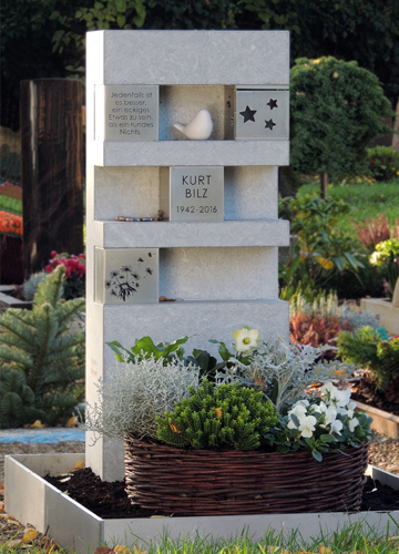 Urnengrabstein aus Kalkstein mit flexiblen Edelstahlwürfeln und geätzter Inschrift