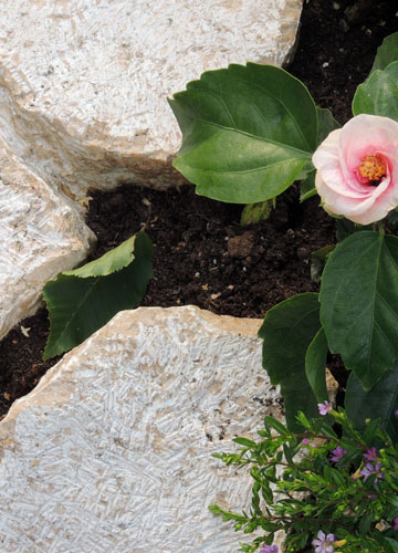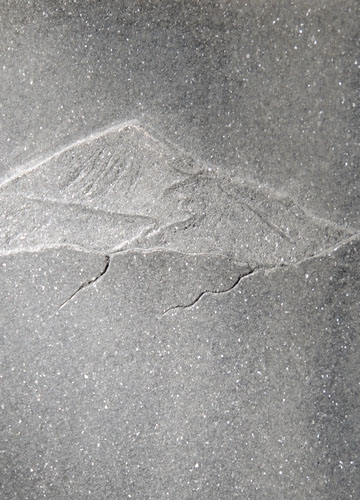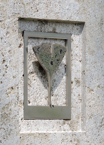 Muschelkalk-Stele mit ausgearbeitetem Rahmen und eingesetztem Ginkgoblatt aus Edelstahl