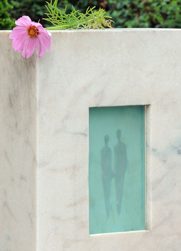 Grabmal aus Marmor mit eingesetzter Glasplatte vor Durchbruch
