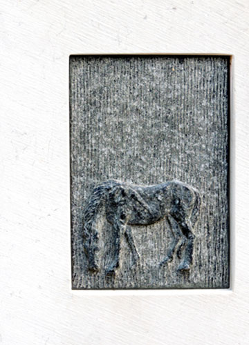 Kalkstein-Stele mit eingesetzter Platte aus Diabas und Relief eines Pferdes